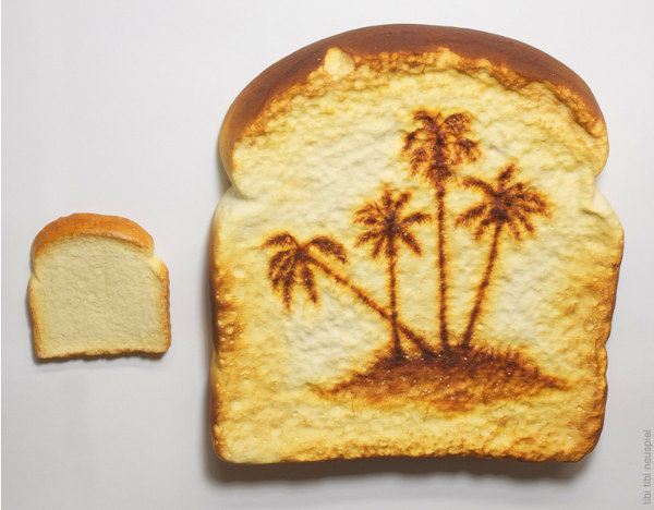 Tibi TIbi Neuspiel, Desert Island Toast (compared to regular piece of toast), 2010. Oil paint and urethane.