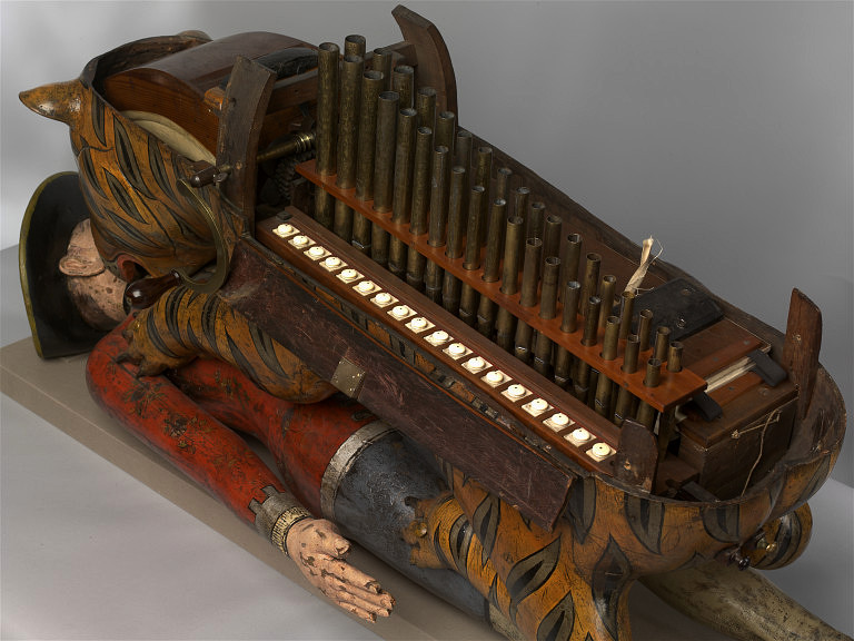 Tipu’s (or Tippoo’s) Tiger is a life-sized wooden mechanical organ made around 1793, depicting a tiger mauling a man in European clothing. When the crank is turned, a hidden mechanism causes the man’s arm to goes up and down, and plays his wails of agony along the growls of the tiger. Under a flap on the tiger’s body there is also a small pipe organ, which can play 18 notes.