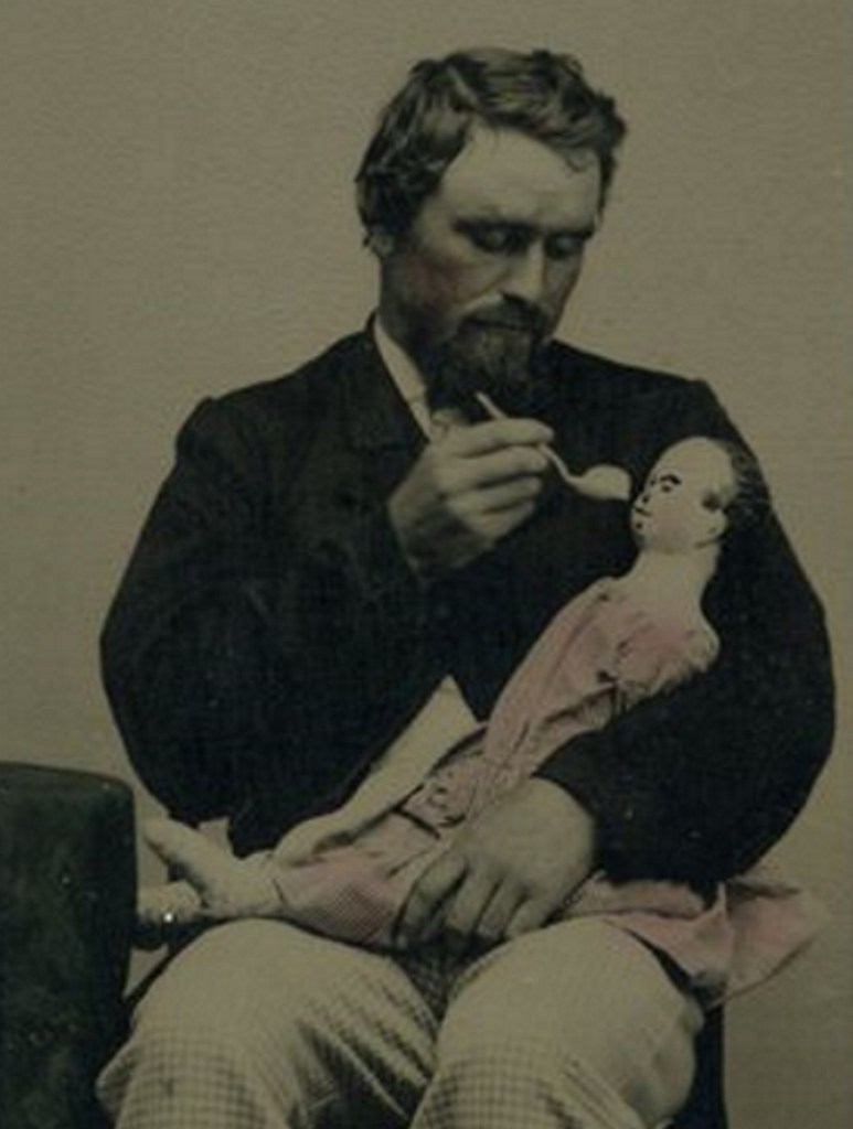 Please help me — I can’t make sense of this bizarre 19th century photograph! It depicts a man tenderly cradling a baby doll, feeding it something from a little dish that sits on the table next to him (see un-cropped version below). Why does this photograph exist?