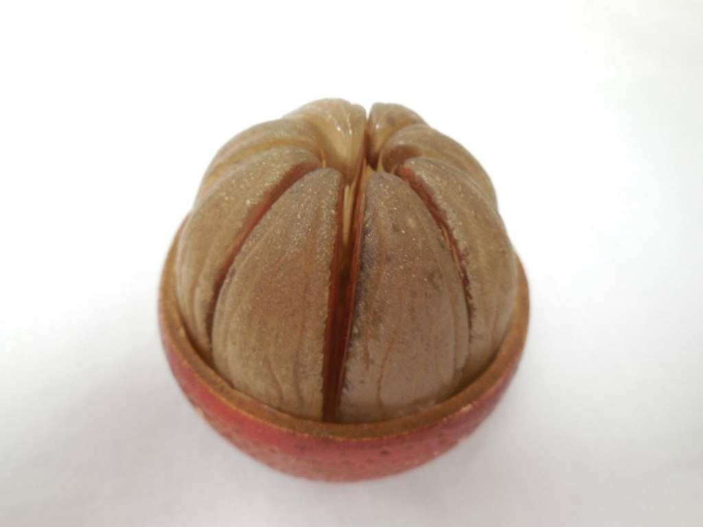 It was manufactured in 1925 for Les Parfums de Marcy “L’Orange Variee” perfume. The scent comes packaged in eight individual glass sections, shaped like orange segments sitting in a painted enamel peel. The segments actually sit upside down to conceal their corks.