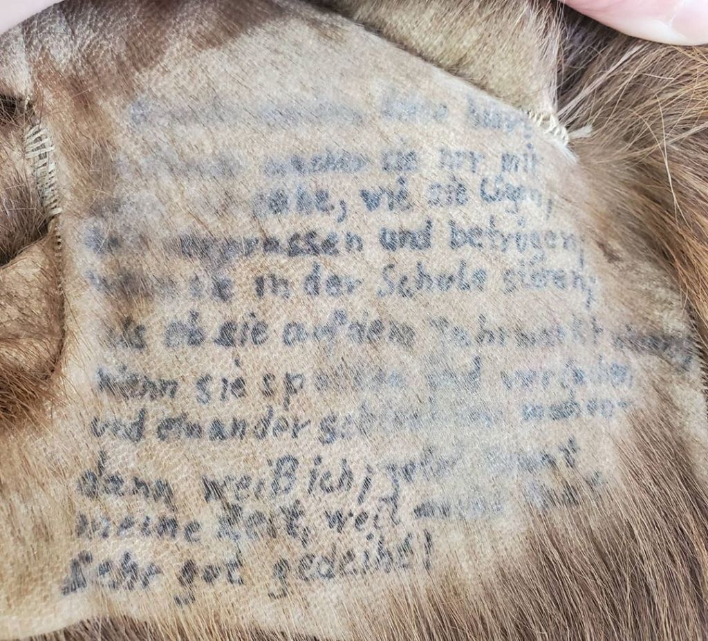 There is a German children’s rhyme hand-written on the palms of the gloves. The original seller provided this rough translation of the words: